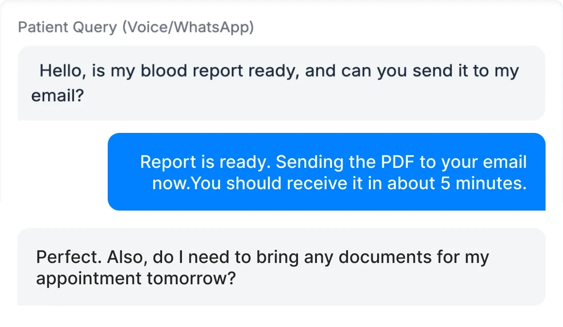 Patients can check dues, download bills, and understand cost breakdowns-all via WhatsApp. Connects securely to the Billing System for instant resolution.