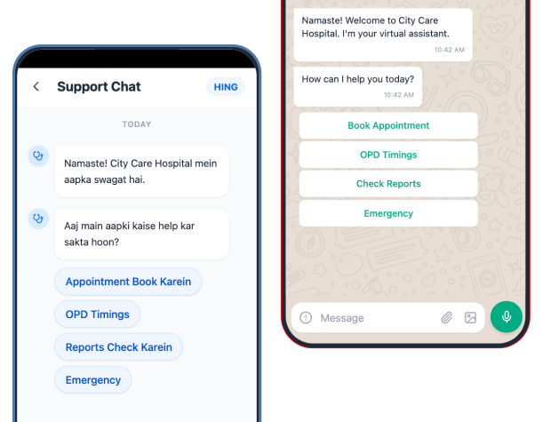 Understands English, Hindi, and Hinglish patient queries seamlessly.